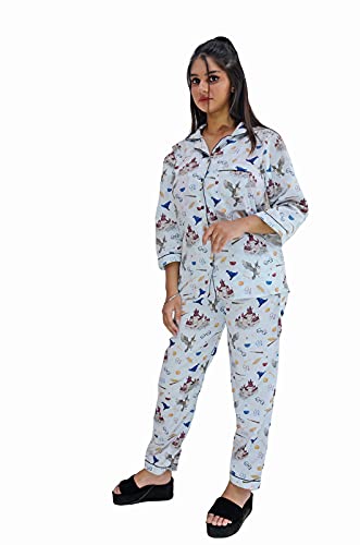 1.Care Instructions: Hand Wash Only 2.Cute, trendy and vibrant shirt and Pyjama Set 2.Material:- Swiss Cotton 2.Two piece Nightwear: Printed Shirt + Pyjama (pajama sets for women/ girls) 2.ASSURANCE & AUTHENTICITY: Quality and satisfaction are asured. There may be some delay in delivery because of the on going pandemic. All our products are dispatched after proper sanitisation. Our facilities are regularly sanitised. To be sure of authenticity, we recommend you to buy this product from "Motley by RiyaJain" brand only. 2.Super comfort fit and soft fabric for a good night sleep or a relaxed day wear. After getting tired or exhausted by having a restless day, The first thing which comes into our mind is to reach home and wear light weight clothes, soft, comfortable night outfits or night suits and lay on bed. So we as Motley have brought a proper formula for your sleep while introducing designer, calming, relaxing, soft, easy to wear night suits/night dress for girls, ladies, women. These are perfect night attire to wear and to go out for a night walk. Motley gives you latest, trendy, fashionable & contemporary day & night cotton printed suits which add four moon to your sleep. Night suits are just as important as what you wear during the office, night outs, or during those date nights. Theres nothing better than getting a proper night’s sleep. If you’re just stepping in the world of night suits and are not sure about how and where to get started we are here for you. A Fashionable and comfortable all over printed Night Suit set which can be added to your lounge wear collection from our store. This top and payjama can be worn by you during your work from home day or a relaxed night. The pyjama has pockets on both sides and elastic waistband with a drawstring. A must-have co-ord (coordinated) set for your wardrobe! This graphic printed coord set from our store is designed in soft swiss cotton fabric that is sure to give you that extra comfort you need when relaxing at home. And may we suggest a pajama party with your friends and family!