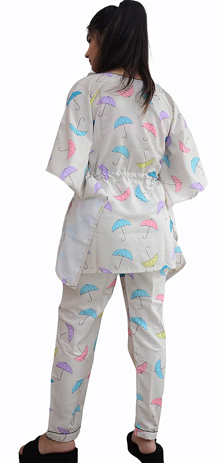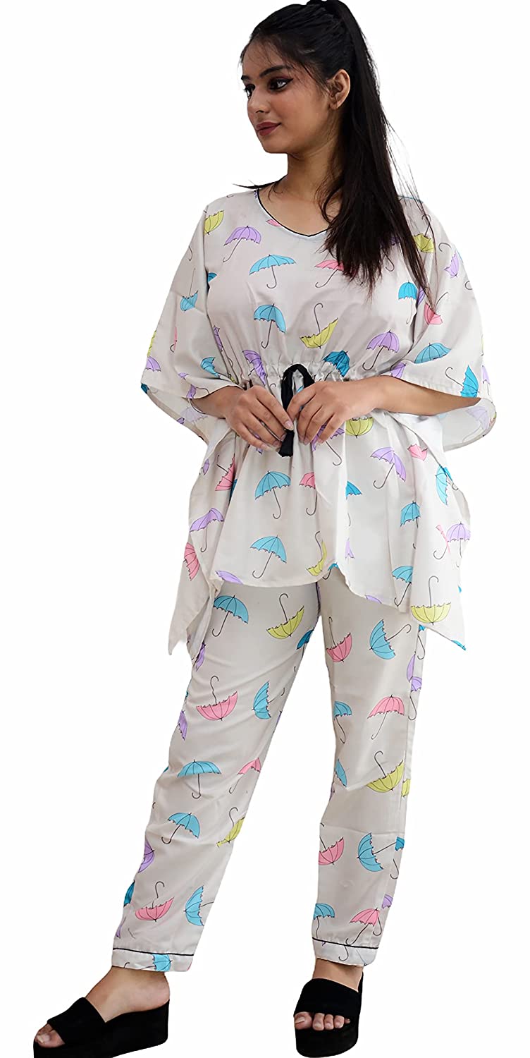 1.Care Instructions: Hand Wash Only 2.Cute, trendy and vibrant Kaftan and Pyjama Set 2.Material:- Swiss Cotton 2.Two piece Nightwear: Printed Kaftan + Pyjama (pajama sets for women/ girls) 2.ASSURANCE & AUTHENTICITY: Quality and satisfaction are asured. There may be some delay in delivery because of the on going pandemic. All our products are dispatched after proper sanitisation. Our facilities are regularly sanitised. To be sure of authenticity, we recommend you to buy this product from "Motley by RiyaJain" brand only. 2.Super comfort fit and soft fabric for a good night sleep or a relaxed day wear. After getting tired or exhausted by having a restless day, The first thing which comes into our mind is to reach home and wear light weight clothes, soft, comfortable night outfits or night suits and lay on bed. So we as Motley have brought a proper formula for your sleep while introducing designer, calming, relaxing, soft, easy to wear night suits/night dress for girls, ladies, women. These are perfect night attire to wear and to go out for a night walk. Motley gives you latest, trendy, fashionable & contemporary day & night cotton printed suits which add four moon to your sleep. Night suits are just as important as what you wear during the office, night outs, or during those date nights. Theres nothing better than getting a proper night’s sleep. If you’re just stepping in the world of night suits and are not sure about how and where to get started we are here for you. A Fashionable and comfortable all over printed Night Suit set which can be added to your lounge wear collection from our store. This top and payjama can be worn by you during your work from home day or a relaxed night. The pyjama has pockets on both sides and elastic waistband with a drawstring. A must-have co-ord (coordinated) set for your wardrobe! This graphic printed coord set from our store is designed in soft swiss cotton fabric that is sure to give you that extra comfort you need when relaxing at home. And may we suggest a pajama party with your friends and family!