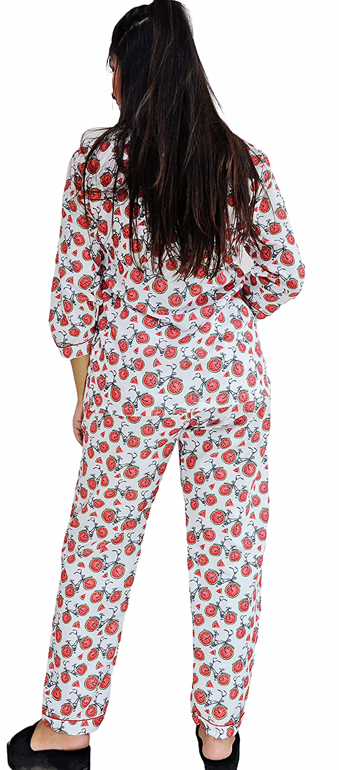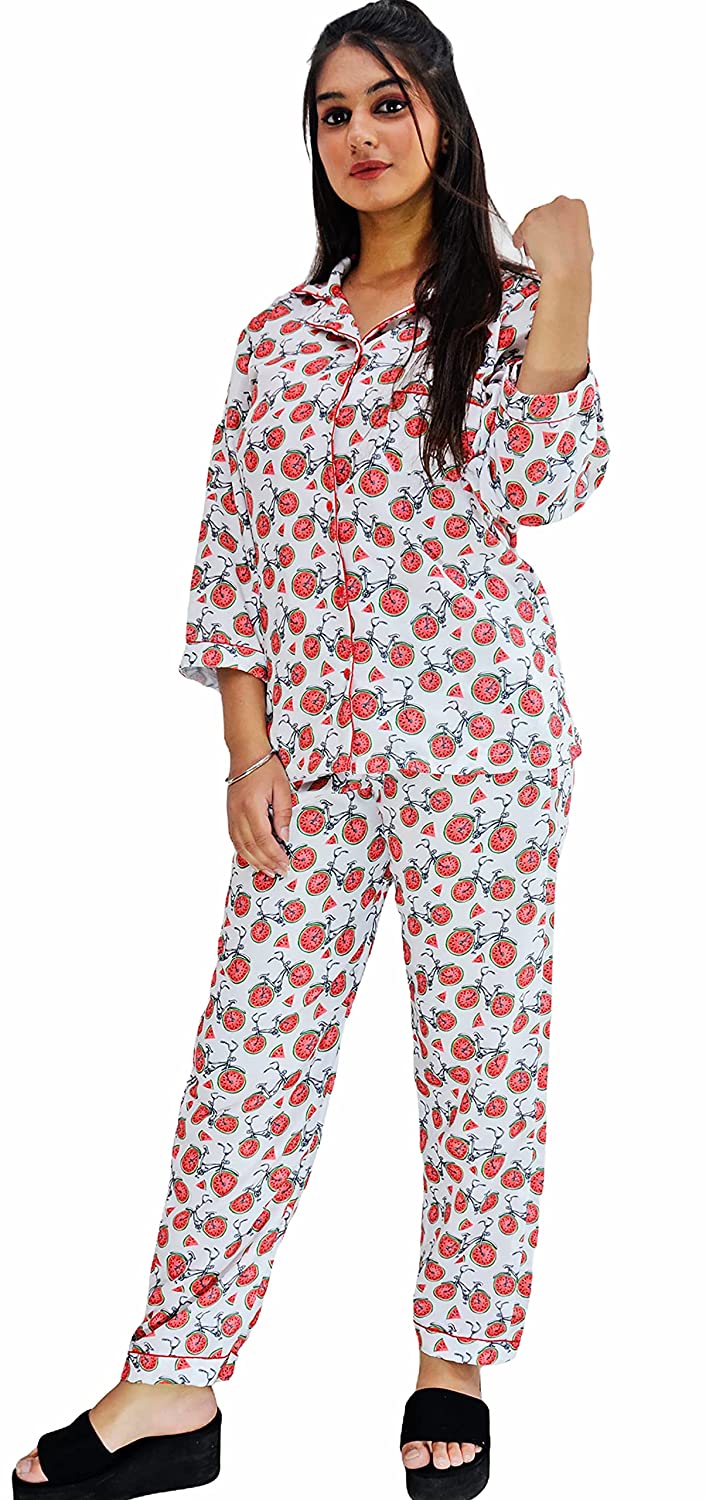 1.Care Instructions: Hand Wash Only 2.Cute, trendy and vibrant shirt and Pyjama Set 2.Material:- Swiss Cotton 2.Two piece Nightwear: Printed Shirt + Pyjama (pajama sets for women/ girls) 2.ASSURANCE & AUTHENTICITY: Quality and satisfaction are asured. There may be some delay in delivery because of the on going pandemic. All our products are dispatched after proper sanitisation. Our facilities are regularly sanitised. To be sure of authenticity, we recommend you to buy this product from "Motley by RiyaJain" brand only. 2.Super comfort fit and soft fabric for a good night sleep or a relaxed day wear. After getting tired or exhausted by having a restless day, The first thing which comes into our mind is to reach home and wear light weight clothes, soft, comfortable night outfits or night suits and lay on bed. So we as Motley have brought a proper formula for your sleep while introducing designer, calming, relaxing, soft, easy to wear night suits/night dress for girls, ladies, women. These are perfect night attire to wear and to go out for a night walk. Motley gives you latest, trendy, fashionable & contemporary day & night cotton printed suits which add four moon to your sleep. Night suits are just as important as what you wear during the office, night outs, or during those date nights. Theres nothing better than getting a proper night’s sleep. If you’re just stepping in the world of night suits and are not sure about how and where to get started we are here for you. A Fashionable and comfortable all over printed Night Suit set which can be added to your lounge wear collection from our store. This top and payjama can be worn by you during your work from home day or a relaxed night. The pyjama has pockets on both sides and elastic waistband with a drawstring. A must-have co-ord (coordinated) set for your wardrobe! This graphic printed coord set from our store is designed in soft swiss cotton fabric that is sure to give you that extra comfort you need when relaxing at home. And may we suggest a pajama party with your friends and family!
