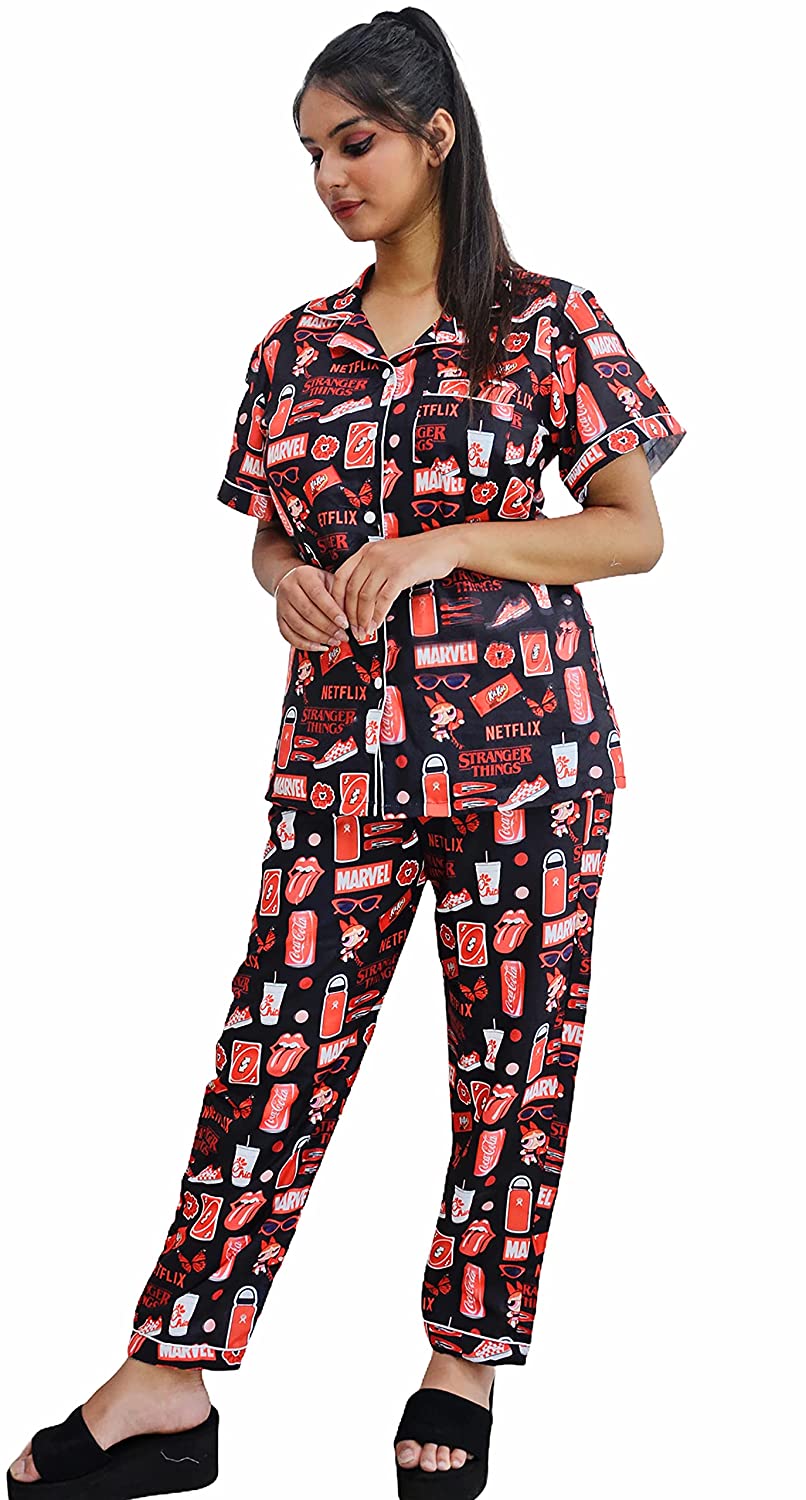1.Care Instructions: Hand Wash Only 2.Cute, trendy and vibrant shirt and Pyjama Set 2.Material:- Swiss Cotton 2.Two piece Nightwear: Printed Shirt + Pyjama (pajama sets for women/ girls) 2.ASSURANCE & AUTHENTICITY: Quality and satisfaction are asured. There may be some delay in delivery because of the on going pandemic. All our products are dispatched after proper sanitisation. Our facilities are regularly sanitised. To be sure of authenticity, we recommend you to buy this product from "Motley by RiyaJain" brand only. 2.Super comfort fit and soft fabric for a good night sleep or a relaxed day wear. After getting tired or exhausted by having a restless day, The first thing which comes into our mind is to reach home and wear light weight clothes, soft, comfortable night outfits or night suits and lay on bed. So we as Motley have brought a proper formula for your sleep while introducing designer, calming, relaxing, soft, easy to wear night suits/night dress for girls, ladies, women. These are perfect night attire to wear and to go out for a night walk. Motley gives you latest, trendy, fashionable & contemporary day & night cotton printed suits which add four moon to your sleep. Night suits are just as important as what you wear during the office, night outs, or during those date nights. Theres nothing better than getting a proper night’s sleep. If you’re just stepping in the world of night suits and are not sure about how and where to get started we are here for you. A Fashionable and comfortable all over printed Night Suit set which can be added to your lounge wear collection from our store. This top and payjama can be worn by you during your work from home day or a relaxed night. The pyjama has pockets on both sides and elastic waistband with a drawstring. A must-have co-ord (coordinated) set for your wardrobe! This graphic printed coord set from our store is designed in soft swiss cotton fabric that is sure to give you that extra comfort you need when relaxing at home. And may we suggest a pajama party with your friends and family!