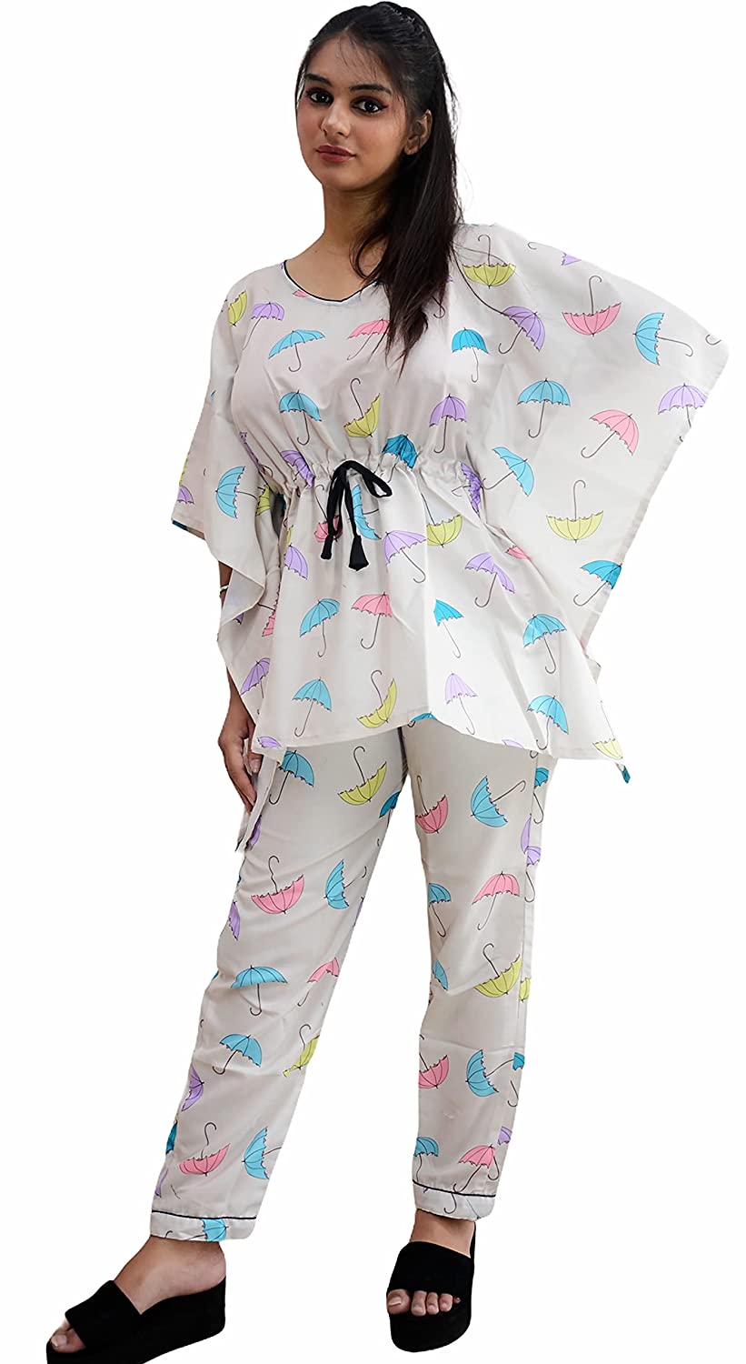 1.Care Instructions: Hand Wash Only 2.Cute, trendy and vibrant Kaftan and Pyjama Set 2.Material:- Swiss Cotton 2.Two piece Nightwear: Printed Kaftan + Pyjama (pajama sets for women/ girls) 2.ASSURANCE & AUTHENTICITY: Quality and satisfaction are asured. There may be some delay in delivery because of the on going pandemic. All our products are dispatched after proper sanitisation. Our facilities are regularly sanitised. To be sure of authenticity, we recommend you to buy this product from "Motley by RiyaJain" brand only. 2.Super comfort fit and soft fabric for a good night sleep or a relaxed day wear. After getting tired or exhausted by having a restless day, The first thing which comes into our mind is to reach home and wear light weight clothes, soft, comfortable night outfits or night suits and lay on bed. So we as Motley have brought a proper formula for your sleep while introducing designer, calming, relaxing, soft, easy to wear night suits/night dress for girls, ladies, women. These are perfect night attire to wear and to go out for a night walk. Motley gives you latest, trendy, fashionable & contemporary day & night cotton printed suits which add four moon to your sleep. Night suits are just as important as what you wear during the office, night outs, or during those date nights. Theres nothing better than getting a proper night’s sleep. If you’re just stepping in the world of night suits and are not sure about how and where to get started we are here for you. A Fashionable and comfortable all over printed Night Suit set which can be added to your lounge wear collection from our store. This top and payjama can be worn by you during your work from home day or a relaxed night. The pyjama has pockets on both sides and elastic waistband with a drawstring. A must-have co-ord (coordinated) set for your wardrobe! This graphic printed coord set from our store is designed in soft swiss cotton fabric that is sure to give you that extra comfort you need when relaxing at home. And may we suggest a pajama party with your friends and family!