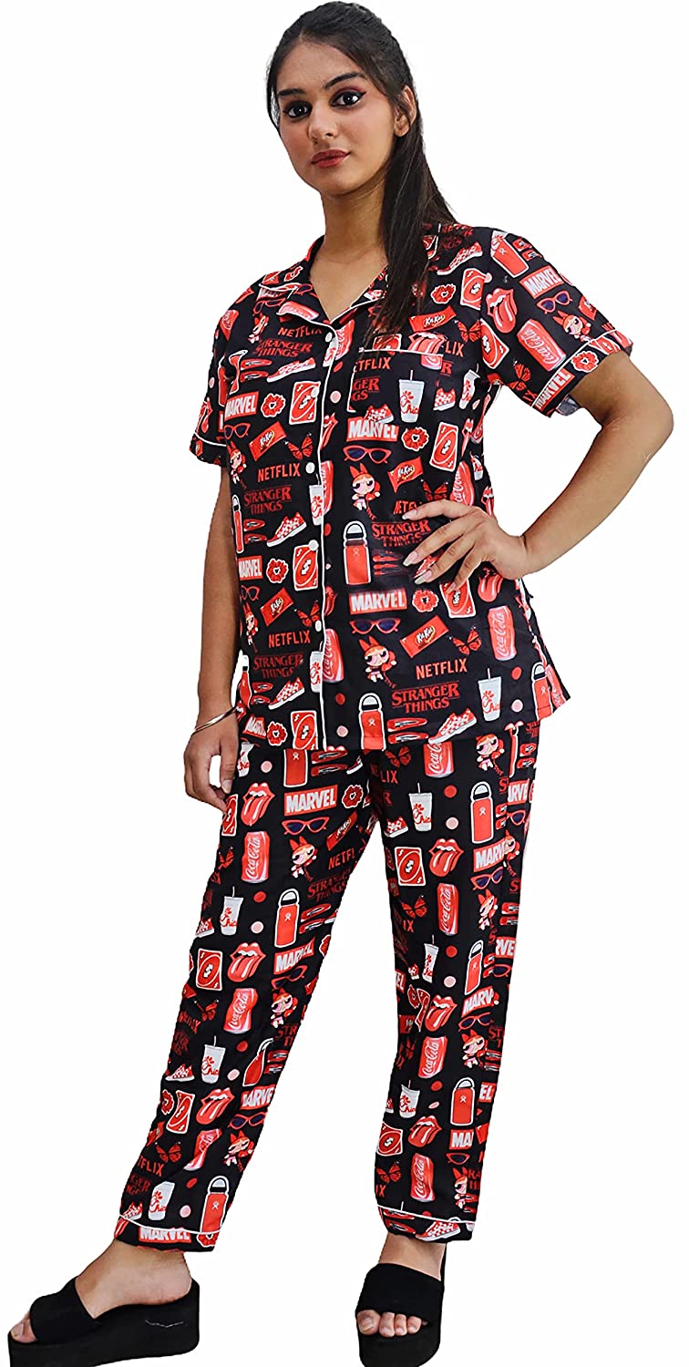 1.Care Instructions: Hand Wash Only 2.Cute, trendy and vibrant shirt and Pyjama Set 2.Material:- Swiss Cotton 2.Two piece Nightwear: Printed Shirt + Pyjama (pajama sets for women/ girls) 2.ASSURANCE & AUTHENTICITY: Quality and satisfaction are asured. There may be some delay in delivery because of the on going pandemic. All our products are dispatched after proper sanitisation. Our facilities are regularly sanitised. To be sure of authenticity, we recommend you to buy this product from "Motley by RiyaJain" brand only. 2.Super comfort fit and soft fabric for a good night sleep or a relaxed day wear. After getting tired or exhausted by having a restless day, The first thing which comes into our mind is to reach home and wear light weight clothes, soft, comfortable night outfits or night suits and lay on bed. So we as Motley have brought a proper formula for your sleep while introducing designer, calming, relaxing, soft, easy to wear night suits/night dress for girls, ladies, women. These are perfect night attire to wear and to go out for a night walk. Motley gives you latest, trendy, fashionable & contemporary day & night cotton printed suits which add four moon to your sleep. Night suits are just as important as what you wear during the office, night outs, or during those date nights. Theres nothing better than getting a proper night’s sleep. If you’re just stepping in the world of night suits and are not sure about how and where to get started we are here for you. A Fashionable and comfortable all over printed Night Suit set which can be added to your lounge wear collection from our store. This top and payjama can be worn by you during your work from home day or a relaxed night. The pyjama has pockets on both sides and elastic waistband with a drawstring. A must-have co-ord (coordinated) set for your wardrobe! This graphic printed coord set from our store is designed in soft swiss cotton fabric that is sure to give you that extra comfort you need when relaxing at home. And may we suggest a pajama party with your friends and family!