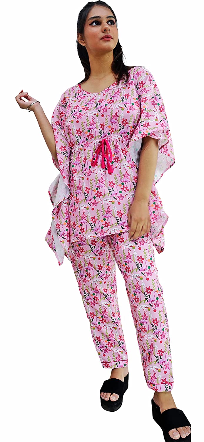 1.Care Instructions: Hand Wash Only 2.Cute, trendy and vibrant Kaftan and Pyjama Set 2.Material:- Swiss Cotton 2.Two piece Nightwear: Printed Kaftan + Pyjama (pajama sets for women/ girls) 2.ASSURANCE & AUTHENTICITY: Quality and satisfaction are asured. There may be some delay in delivery because of the on going pandemic. All our products are dispatched after proper sanitisation. Our facilities are regularly sanitised. To be sure of authenticity, we recommend you to buy this product from "Motley by RiyaJain" brand only. 2.Super comfort fit and soft fabric for a good night sleep or a relaxed day wear. After getting tired or exhausted by having a restless day, The first thing which comes into our mind is to reach home and wear light weight clothes, soft, comfortable night outfits or night suits and lay on bed. So we as Motley have brought a proper formula for your sleep while introducing designer, calming, relaxing, soft, easy to wear night suits/night dress for girls, ladies, women. These are perfect night attire to wear and to go out for a night walk. Motley gives you latest, trendy, fashionable & contemporary day & night cotton printed suits which add four moon to your sleep. Night suits are just as important as what you wear during the office, night outs, or during those date nights. Theres nothing better than getting a proper night’s sleep. If you’re just stepping in the world of night suits and are not sure about how and where to get started we are here for you. A Fashionable and comfortable all over printed Night Suit set which can be added to your lounge wear collection from our store. This top and payjama can be worn by you during your work from home day or a relaxed night. The pyjama has pockets on both sides and elastic waistband with a drawstring. A must-have co-ord (coordinated) set for your wardrobe! This graphic printed coord set from our store is designed in soft swiss cotton fabric that is sure to give you that extra comfort you need when relaxing at home. And may we suggest a pajama party with your friends and family!