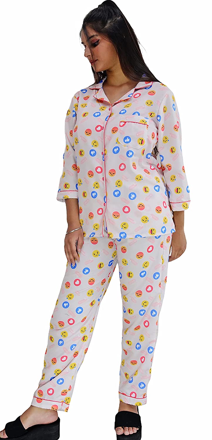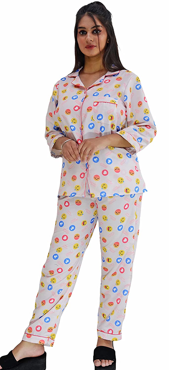 1.Care Instructions: Hand Wash Only 2.Cute, trendy and vibrant shirt and Pyjama Set 2.Material:- Swiss Cotton 2.Two piece Nightwear: Printed Shirt + Pyjama (pajama sets for women/ girls) 2.ASSURANCE & AUTHENTICITY: Quality and satisfaction are asured. There may be some delay in delivery because of the on going pandemic. All our products are dispatched after proper sanitisation. Our facilities are regularly sanitised. To be sure of authenticity, we recommend you to buy this product from "Motley by RiyaJain" brand only. 2.Super comfort fit and soft fabric for a good night sleep or a relaxed day wear. After getting tired or exhausted by having a restless day, The first thing which comes into our mind is to reach home and wear light weight clothes, soft, comfortable night outfits or night suits and lay on bed. So we as Motley have brought a proper formula for your sleep while introducing designer, calming, relaxing, soft, easy to wear night suits/night dress for girls, ladies, women. These are perfect night attire to wear and to go out for a night walk. Motley gives you latest, trendy, fashionable & contemporary day & night cotton printed suits which add four moon to your sleep. Night suits are just as important as what you wear during the office, night outs, or during those date nights. Theres nothing better than getting a proper night’s sleep. If you’re just stepping in the world of night suits and are not sure about how and where to get started we are here for you. A Fashionable and comfortable all over printed Night Suit set which can be added to your lounge wear collection from our store. This top and payjama can be worn by you during your work from home day or a relaxed night. The pyjama has pockets on both sides and elastic waistband with a drawstring. A must-have co-ord (coordinated) set for your wardrobe! This graphic printed coord set from our store is designed in soft swiss cotton fabric that is sure to give you that extra comfort you need when relaxing at home. And may we suggest a pajama party with your friends and family!