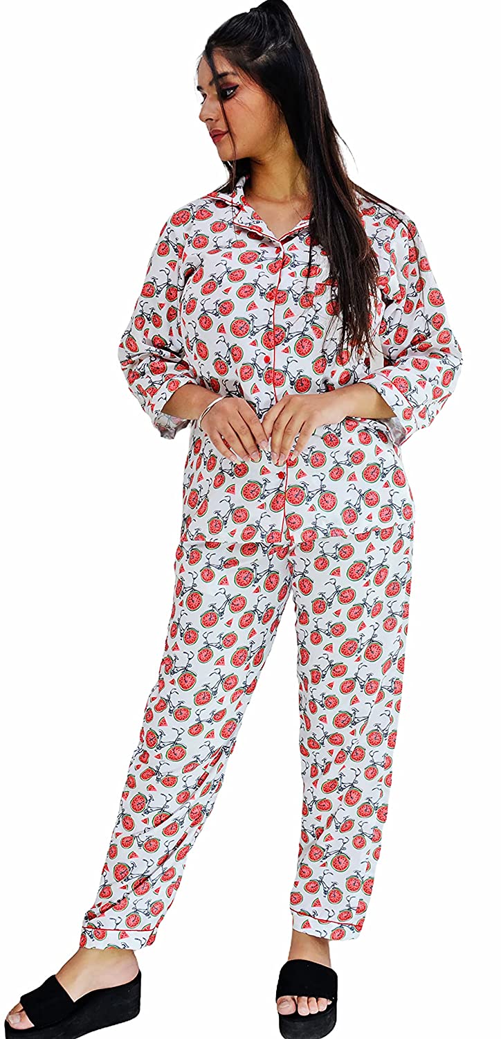 1.Care Instructions: Hand Wash Only 2.Cute, trendy and vibrant shirt and Pyjama Set 2.Material:- Swiss Cotton 2.Two piece Nightwear: Printed Shirt + Pyjama (pajama sets for women/ girls) 2.ASSURANCE & AUTHENTICITY: Quality and satisfaction are asured. There may be some delay in delivery because of the on going pandemic. All our products are dispatched after proper sanitisation. Our facilities are regularly sanitised. To be sure of authenticity, we recommend you to buy this product from "Motley by RiyaJain" brand only. 2.Super comfort fit and soft fabric for a good night sleep or a relaxed day wear. After getting tired or exhausted by having a restless day, The first thing which comes into our mind is to reach home and wear light weight clothes, soft, comfortable night outfits or night suits and lay on bed. So we as Motley have brought a proper formula for your sleep while introducing designer, calming, relaxing, soft, easy to wear night suits/night dress for girls, ladies, women. These are perfect night attire to wear and to go out for a night walk. Motley gives you latest, trendy, fashionable & contemporary day & night cotton printed suits which add four moon to your sleep. Night suits are just as important as what you wear during the office, night outs, or during those date nights. Theres nothing better than getting a proper night’s sleep. If you’re just stepping in the world of night suits and are not sure about how and where to get started we are here for you. A Fashionable and comfortable all over printed Night Suit set which can be added to your lounge wear collection from our store. This top and payjama can be worn by you during your work from home day or a relaxed night. The pyjama has pockets on both sides and elastic waistband with a drawstring. A must-have co-ord (coordinated) set for your wardrobe! This graphic printed coord set from our store is designed in soft swiss cotton fabric that is sure to give you that extra comfort you need when relaxing at home. And may we suggest a pajama party with your friends and family!