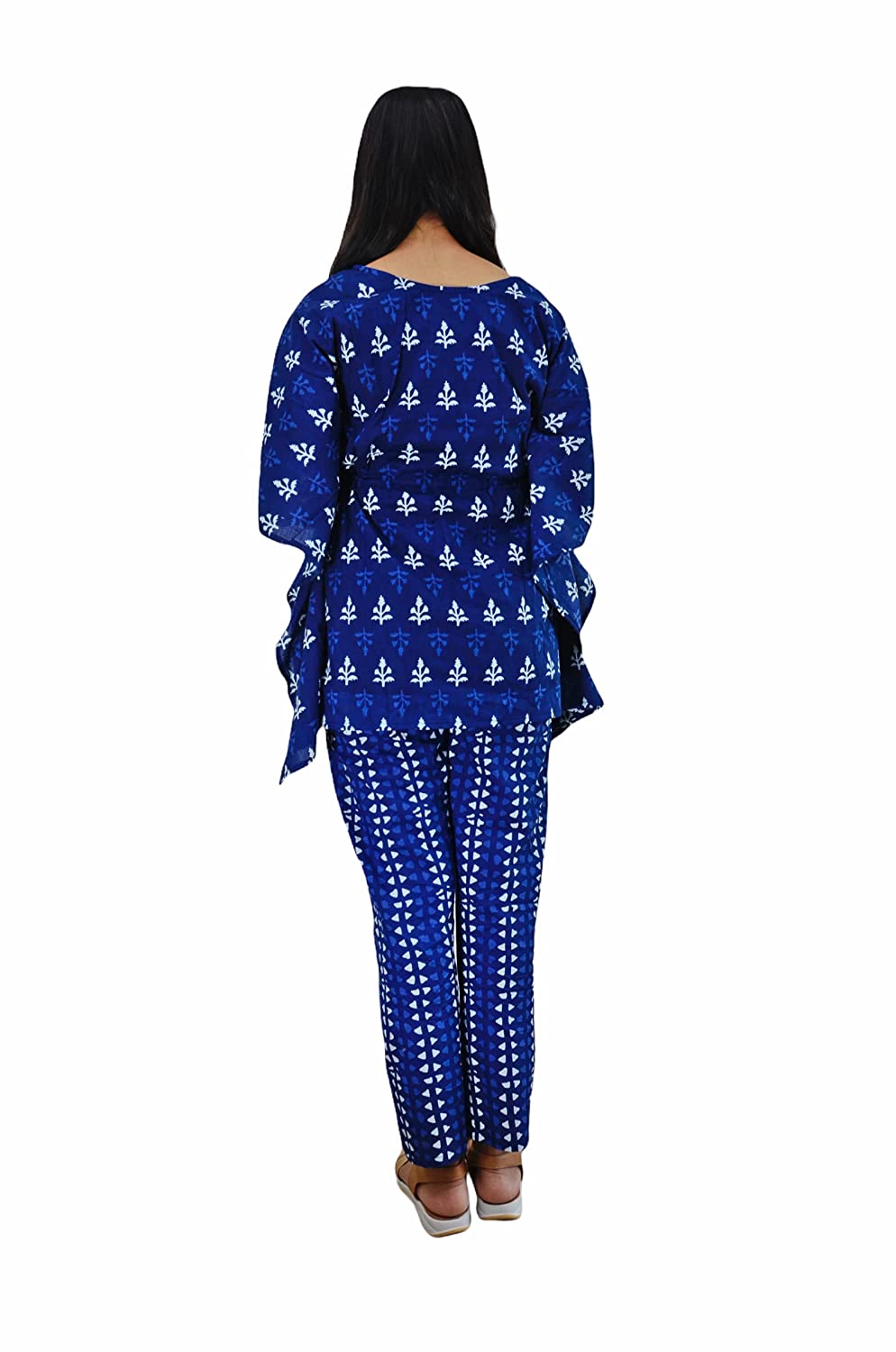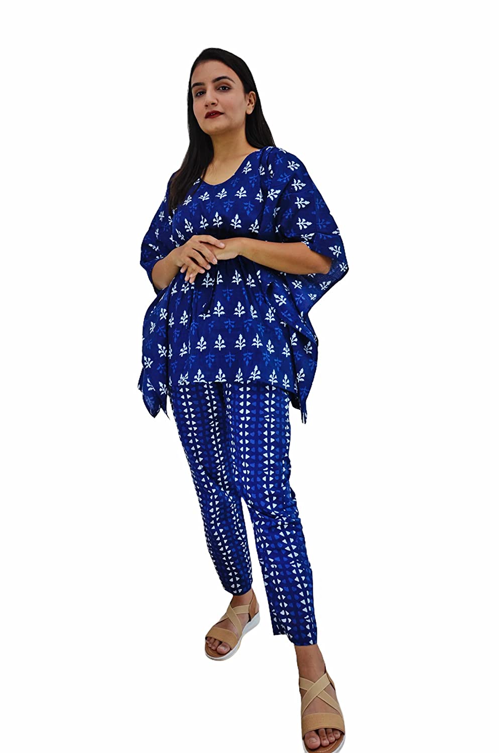 A Sanganeri Indigo printed Night Suit set which can be added to your lounge wear collection from our store. Beautifully crafted Kaaftan top in v neck with matching printed pyjamas creates a set of product which can worn by you during your work from home day, an outing with friends or a relaxed night. The pyjama has pockets on both sides and elastic waistband with a drawstring. A must-have co-ord (coordinated) set for your wardrobe! This floral sanganeri screen printed coord set from our store is designed in soft pure cotton fabric that is sure to give you that extra comfort you need when relaxing at home. And may we suggest an outing with friends or family.