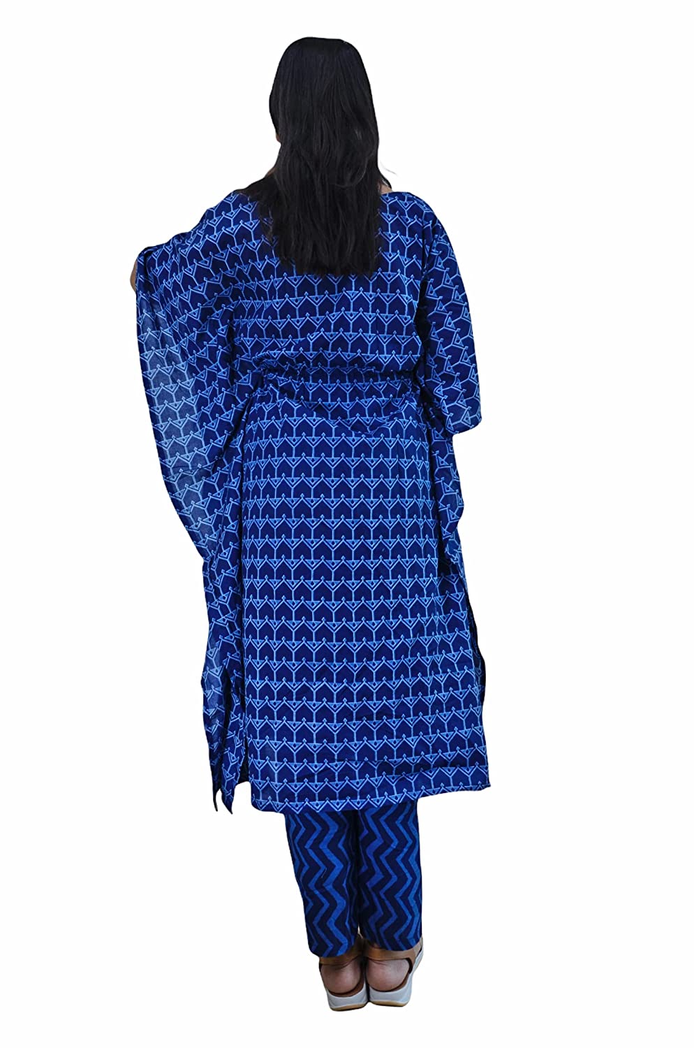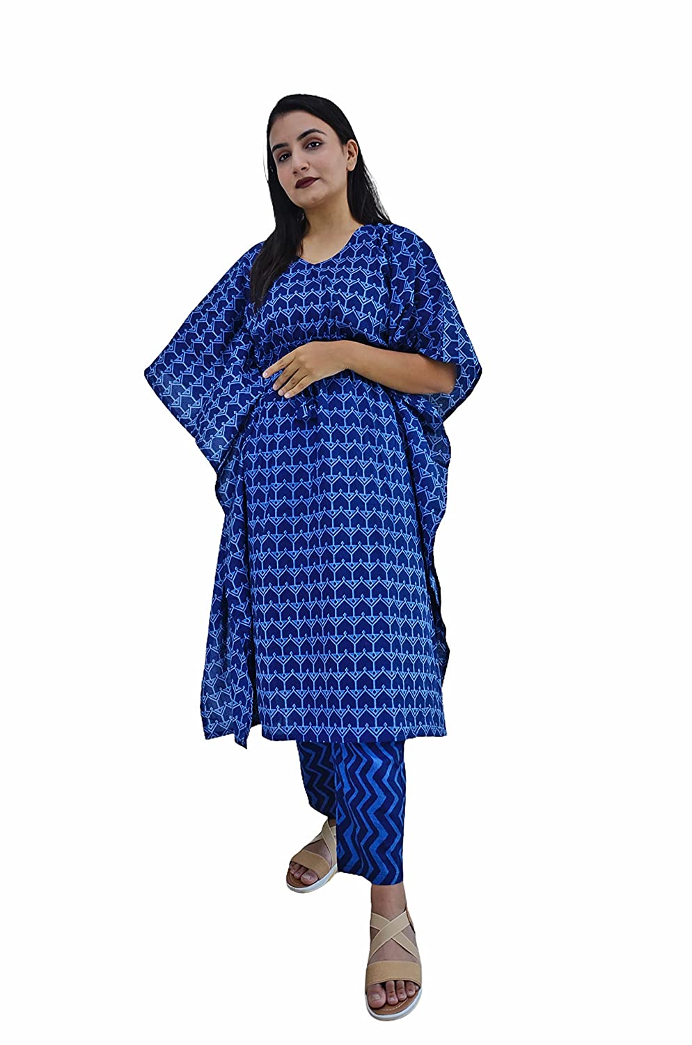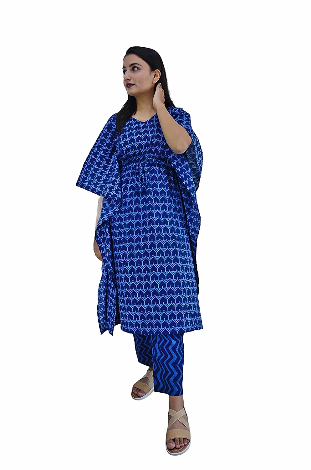 A Sanganeri printed Indigo Kaftan kurti Night Suit set which can be added to your lounge wear collection from our store. Beautifully crafted Kaaftan in v neck with matching printed pyjamas creates a set of product which can worn by you during your work from home day, an outing with friends or a relaxed night. The pyjama has pockets on both sides and elastic waistband with a drawstring. A must-have co-ord (coordinated) set for your wardrobe! This Indigo sanganeri screen printed coord set from our store is designed in soft pure cotton fabric that is sure to give you that extra comfort you need when relaxing at home. And may we suggest an outing with friends or family.