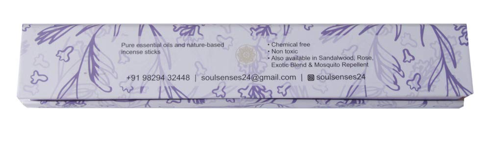 Soul Senses brings you the most sought-after range of incense sticks. Soul Senses Lavender Incense Sticks have been crafted using freshest batch of lavender flowers combined with 100% pure essential oils. Its divine aroma is therapeutic and will bring in peace and healing powers. Excellent while meditating, or stressed as calming and removes negative energies, the essential oils adds to the aroma bringing peace, serenity. It heals all sorts of issues especially psychological. Chemical free, 100% free of herbicides, pesticides, chemicals. Therapeutic quality made from fresh flowers, barks, needles, resins etc. Safe for inhalation as we are dedicated to provide products without the intervention of pesticides, chemicals and herbicides. Excellent while meditating, or stressed as calming and removes negative energies. It is also known to heal and brings peace. Ideal for creating a calming atmosphere at home, office, perfect for Pooja, Hawan, Puja, Therapy, Meditation, Gifting & Yoga. Considering preferential choices, the incense sticks are suitable for vegans. Our unmatched sealed packaging retains the aroma and is ideal for export and gifting purposes too.